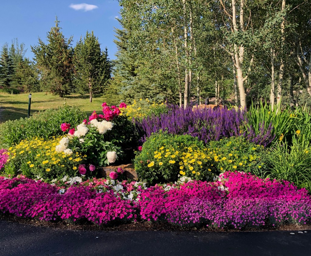 Profusion of annuals in Arrowhead…red, pink and coral geraniums with lilac petunias.