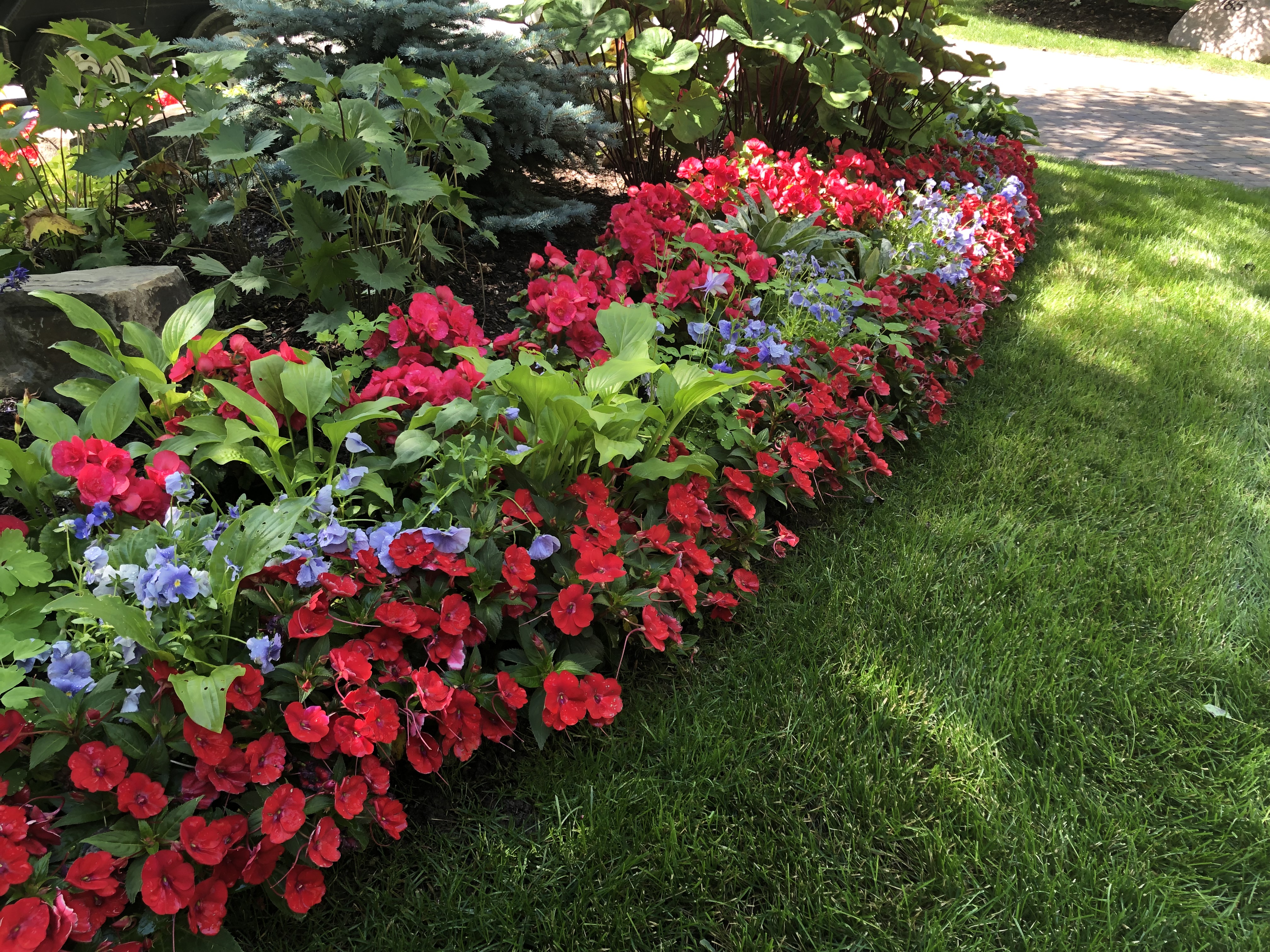 Shade garden looking colorful with red sunpatiens, blue pansies, hostas and begonias.