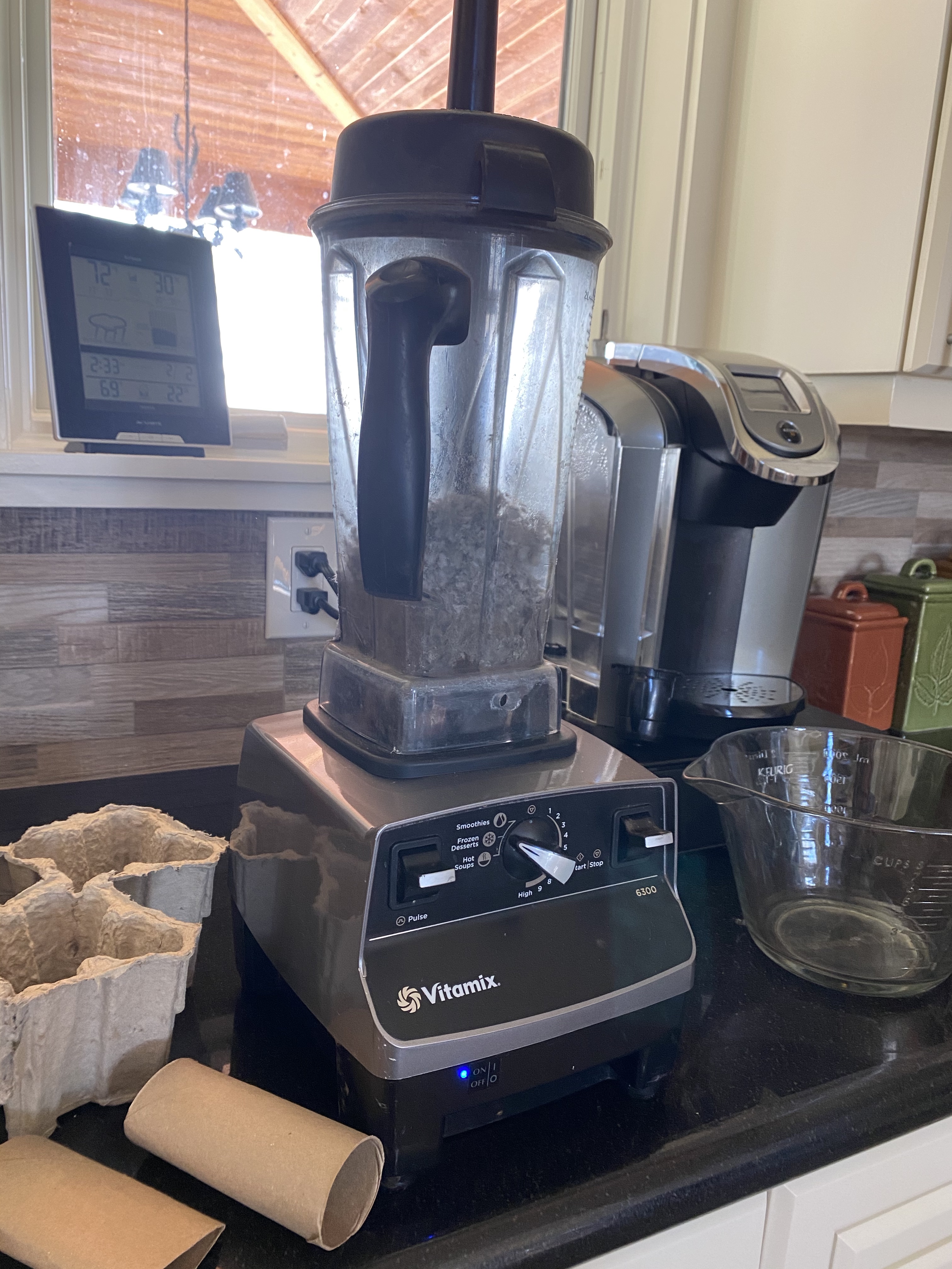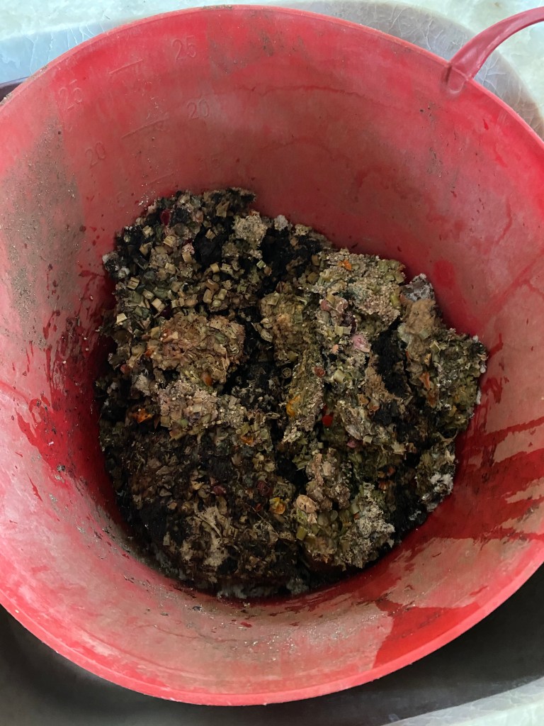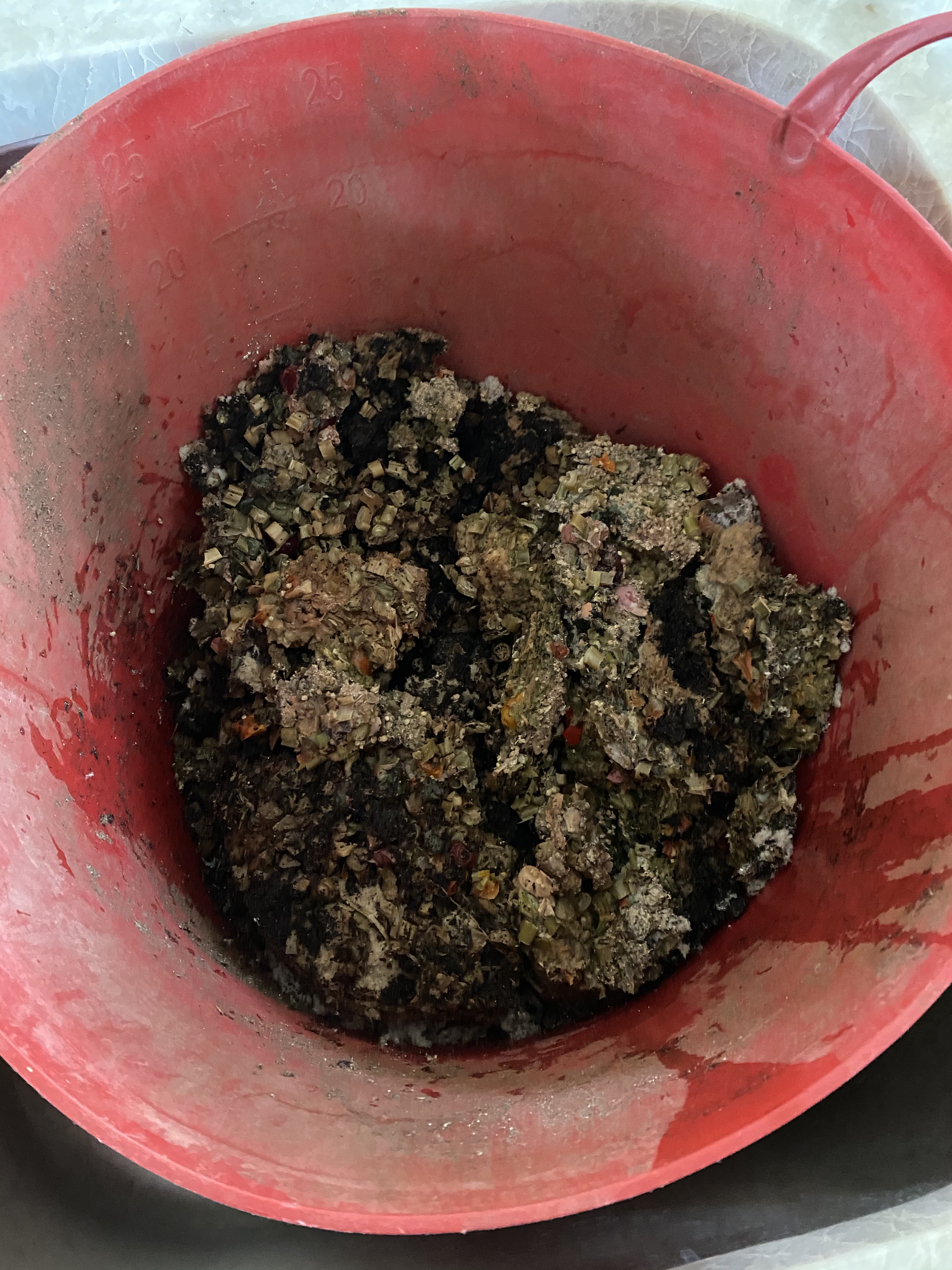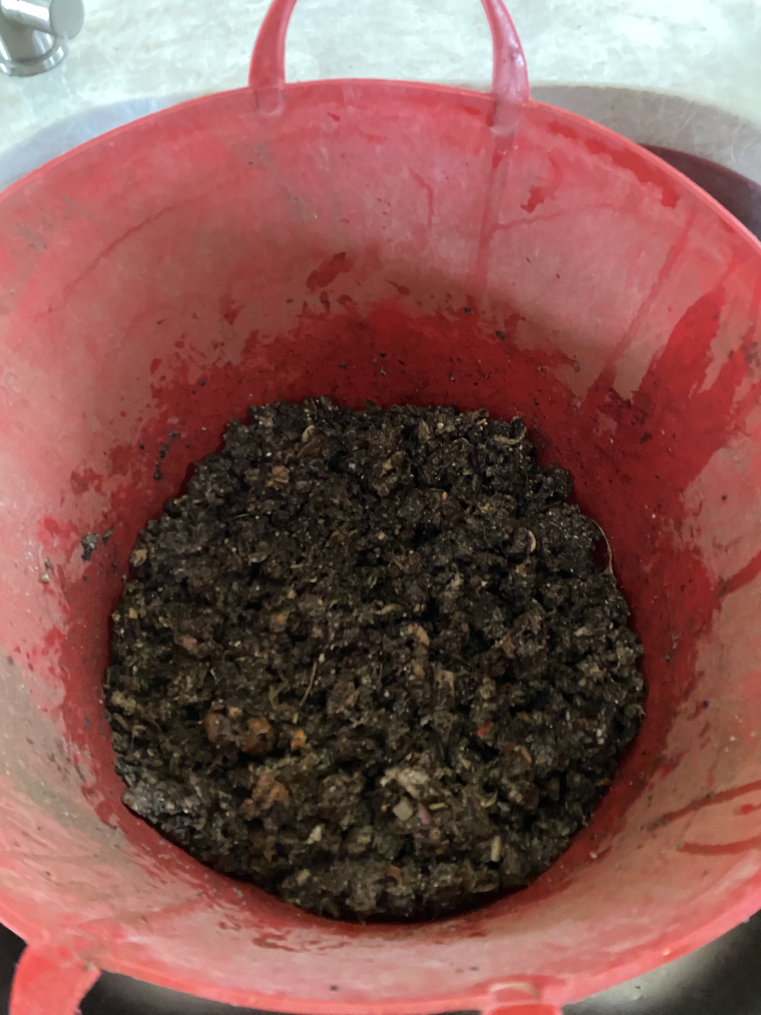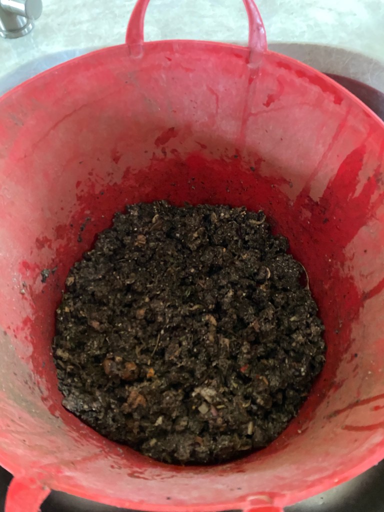 I store the greens in a 10-cup seal-tight container under my sink and once it’s full I mix a batch! (10 cups green to approx 24 – 30 cups brown)