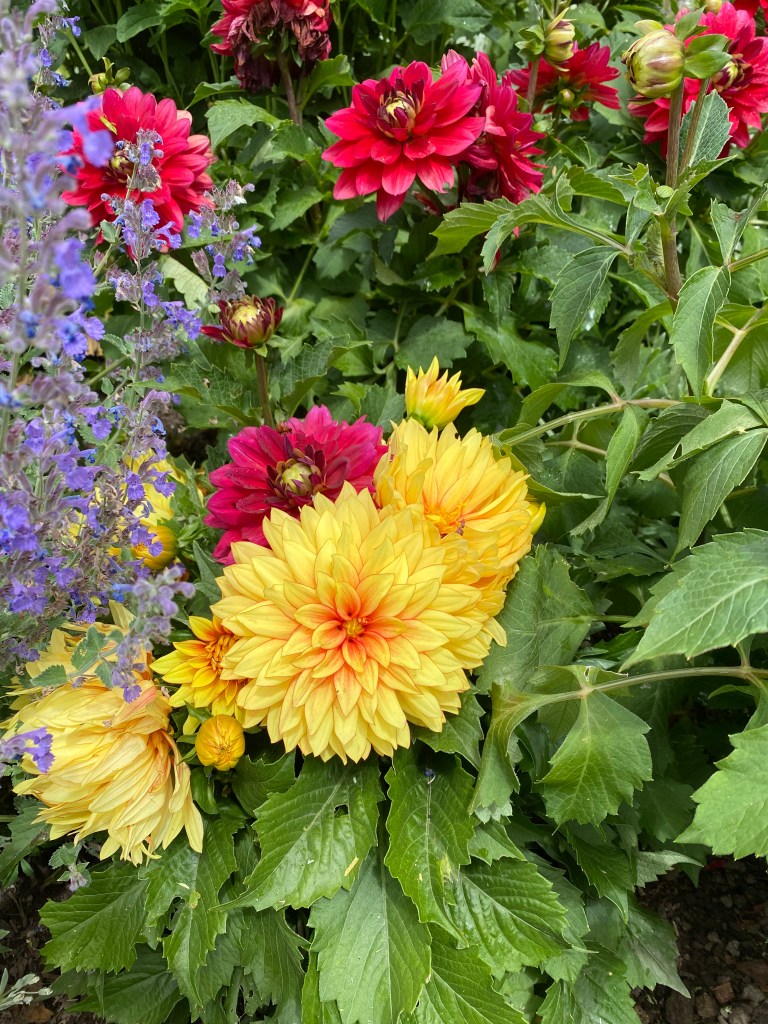 Dahlias. Plant them as tubers after the last frost. Depending on the zone where you live, you may have to dig up the tubers in the fall and store them over winter. We have done a blog post about dahlias. Let me just add that you are missing out if you do not have these beauties in your garden.